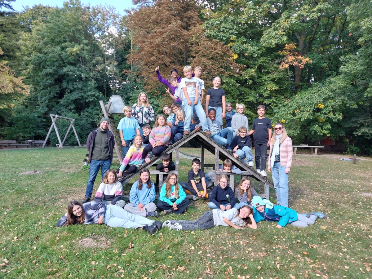 Als wir in der Jugendherberge Erlenried angekommen sind, haben wir erstmal unsere Koffer entgegengenommen, die die Eltern vorher vorbeigebracht haben. Danach haben wir die Zimmeraufteilung gemacht. Es gab ein 10er und ein 8er Jungenzimmer. Die Mädchen hatten zwei 6er Zimmer. Danach gab es Mittag, Spaghetti, das sehr lecker war. Als wir fertig gegessen hatten, haben wir Spiele gespielt. Dazwischen gab es Pausen, in denen wir uns im Tiefseilgarten und auf dem riesigen Spielplatz austoben konnten. Auf dem unteren Teil vom Hof leben Nutrias. Sie sahen sehr süß aus. Manche Kinder dachten zuerst, es wären Wasserschweine. Aber die Erwachsenen haben es uns erklärt. Anschließend hatten die Erwachsenen eine kleine Rallye vorbereitet und danach war auch schon Zeit für das Abendbrot. Zu Essen gab es Brot und allerlei Aufstriche. Als wir alle zusammen abgeräumt hatten und der Tischdienst die Tische abgewischt hatte, sind wir in unsere Zimmer gegangen und haben uns mit Papiernachrichten ausgetauscht. Als es dann hieß, dass wir eine Nachtwanderung machen, freuten sich alle und waren aufgeregt. Wir haben uns angezogen und sind mit Taschenlampen bewaffnet nach draußen marschiert. Wir Mädchen haben während der Wanderung laut gesungen. Zurück in der Jugendherberge haben wir uns bettfertig gemacht und uns in unsere Betten gelegt. Leider waren die Wände und Türen sehr dünn, deshalb war um 21 Uhr schon Bettruhe. Die Nacht war kurz dank zahlreichen Frühaufstehern.