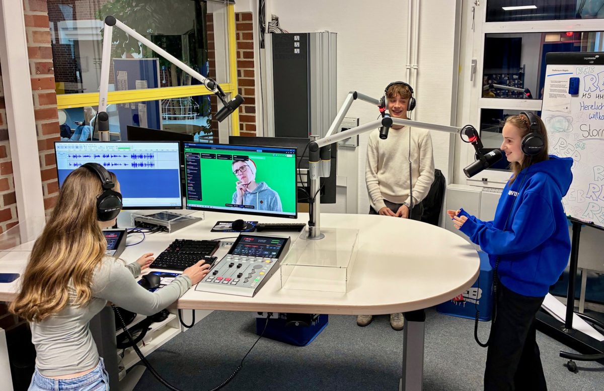 Foto: Caitlin, Jakob und Marie aus der REB-Redaktion bei der Vorbereitung der Sendung zum Thema Jugendkultur in Stormarn