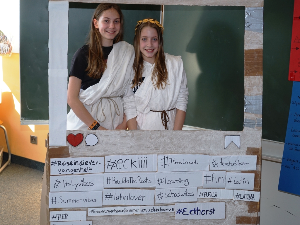Latein kann am Gymnasium Eckhorst neben Französisch und Spanisch ab Klasse 7 als zweite Fremdsprache gewählt werden. Die Unterrichtssprache ist Deutsch. Wir übersetzen im Lateinunterricht hauptsächlich Texte aus der Originalsprache ins Deutsche, manchmal werden aber auch als kreative Aufgabe oder Grammatikübung lateinische Texte selbst formuliert. Das Lateinische wird so gesprochen, wie es geschrieben wird, so dass es kaum Probleme mit Aussprache oder Rechtschreibung gibt.